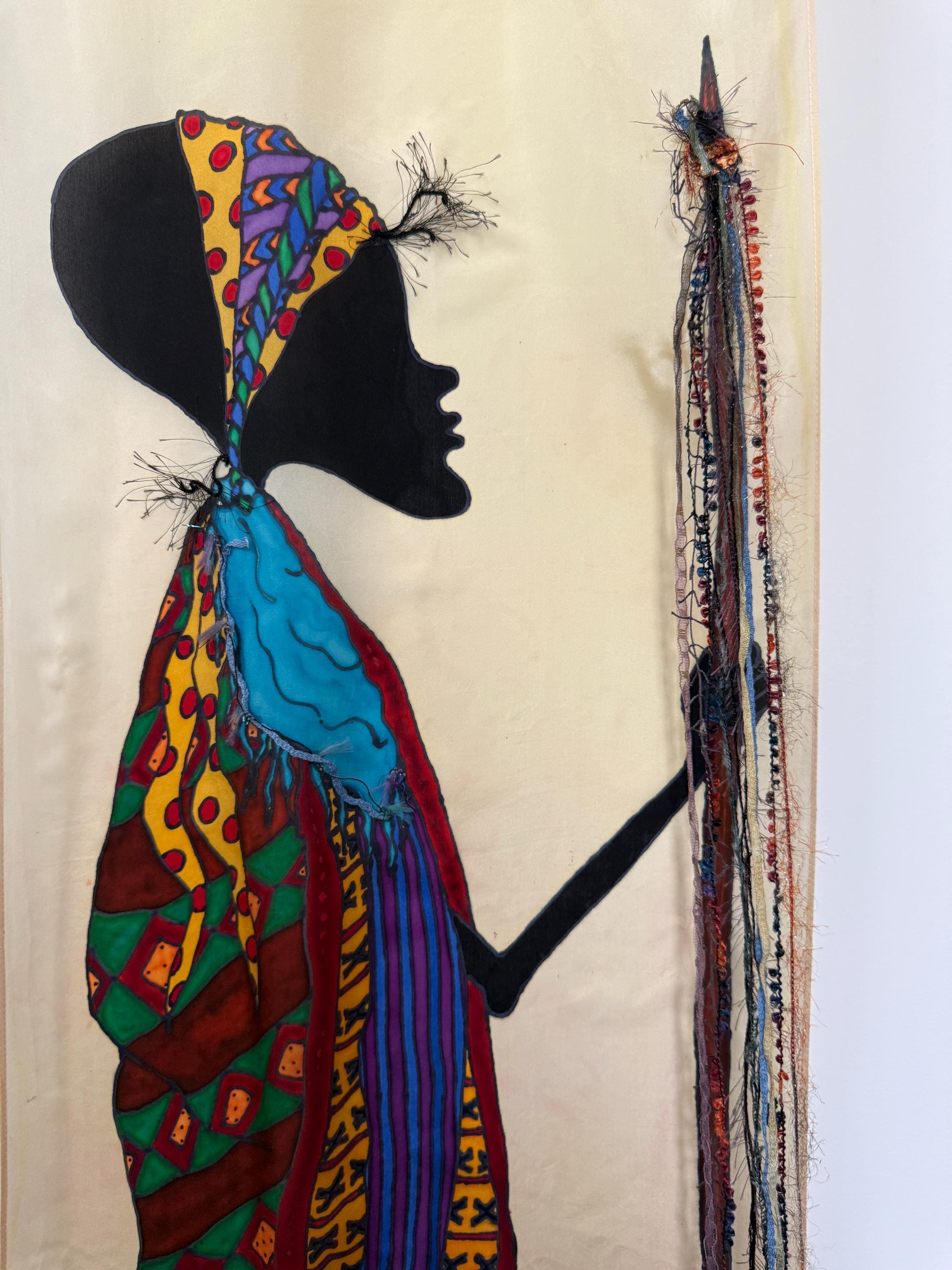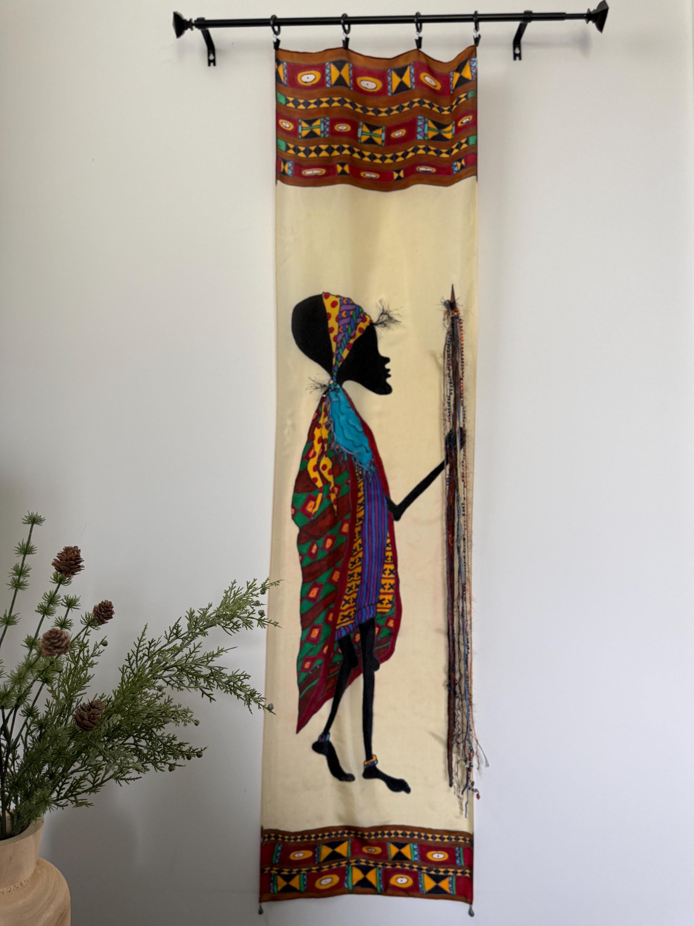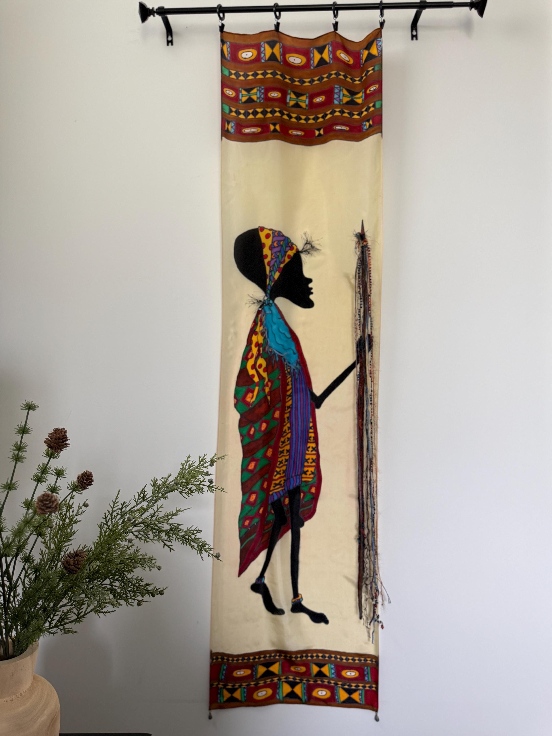 This beautiful silk wall hanging measures 15" x 60", includes the rod and 4 clips for hanging and is weighted down by 2 tiny weights at the bottom. Embellished with yarns and fibers for added dimension.