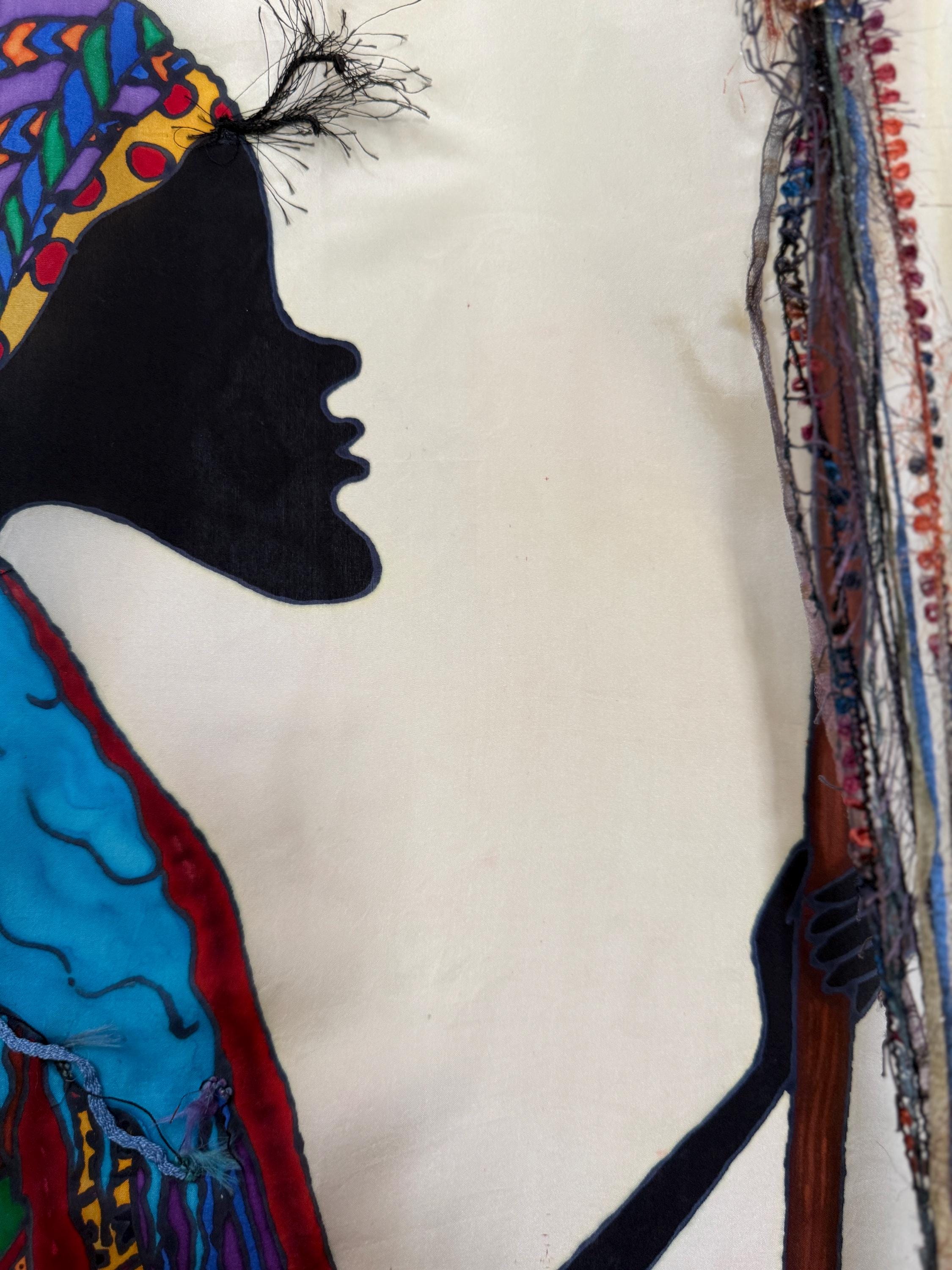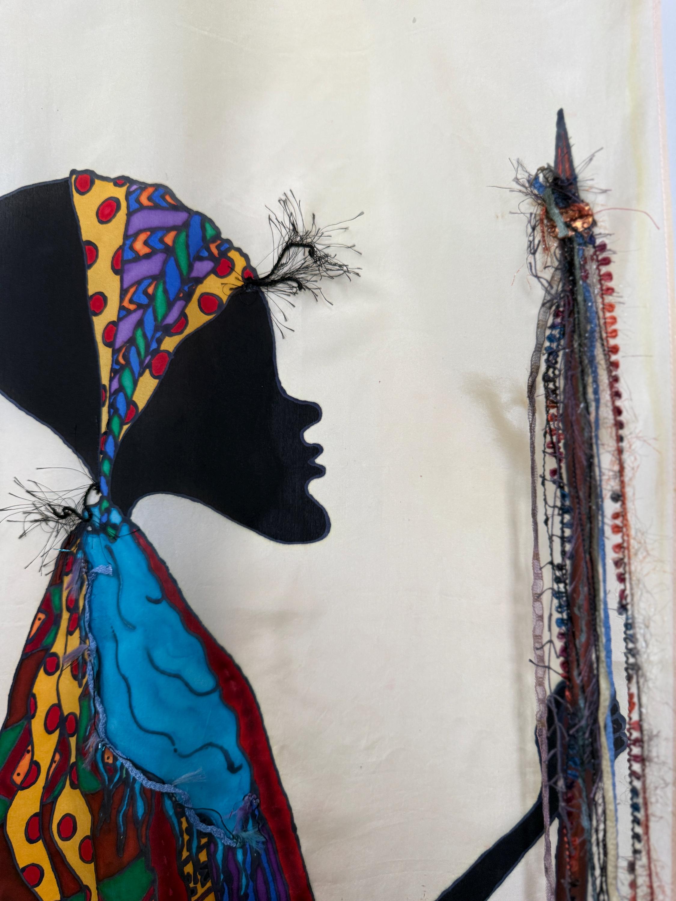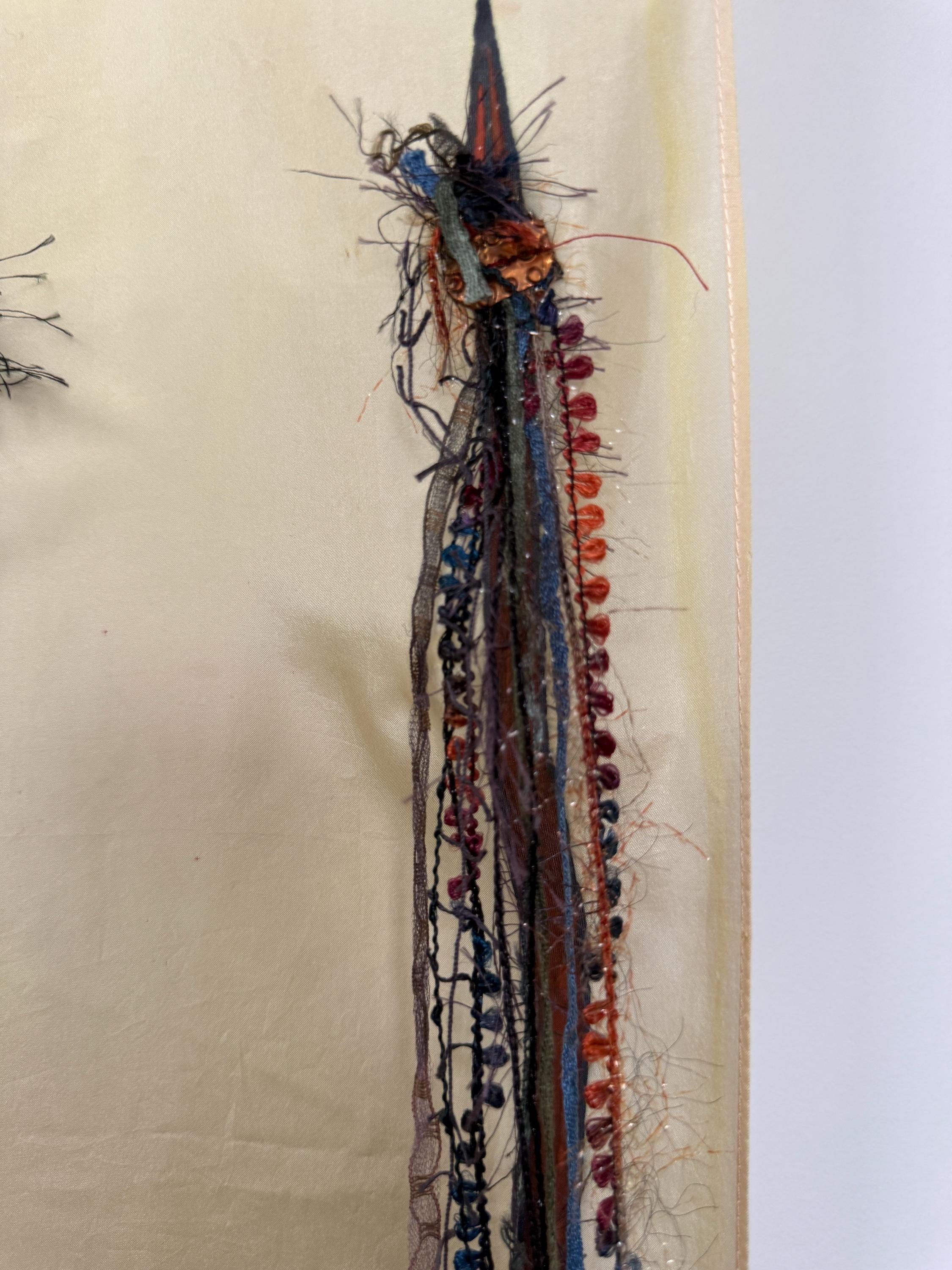 This beautiful silk wall hanging measures 15" x 60", includes the rod and 4 clips for hanging and is weighted down by 2 tiny weights at the bottom. Embellished with yarns and fibers for added dimension.