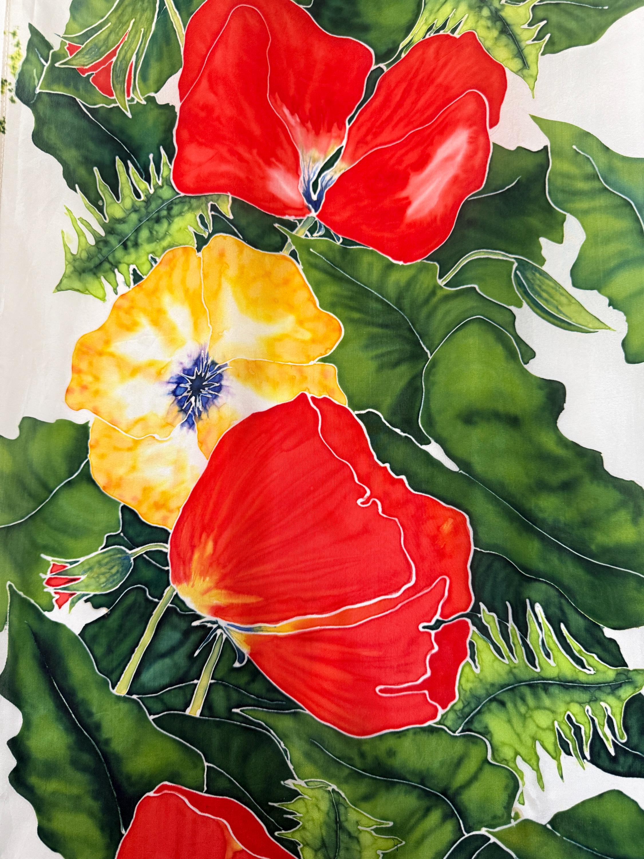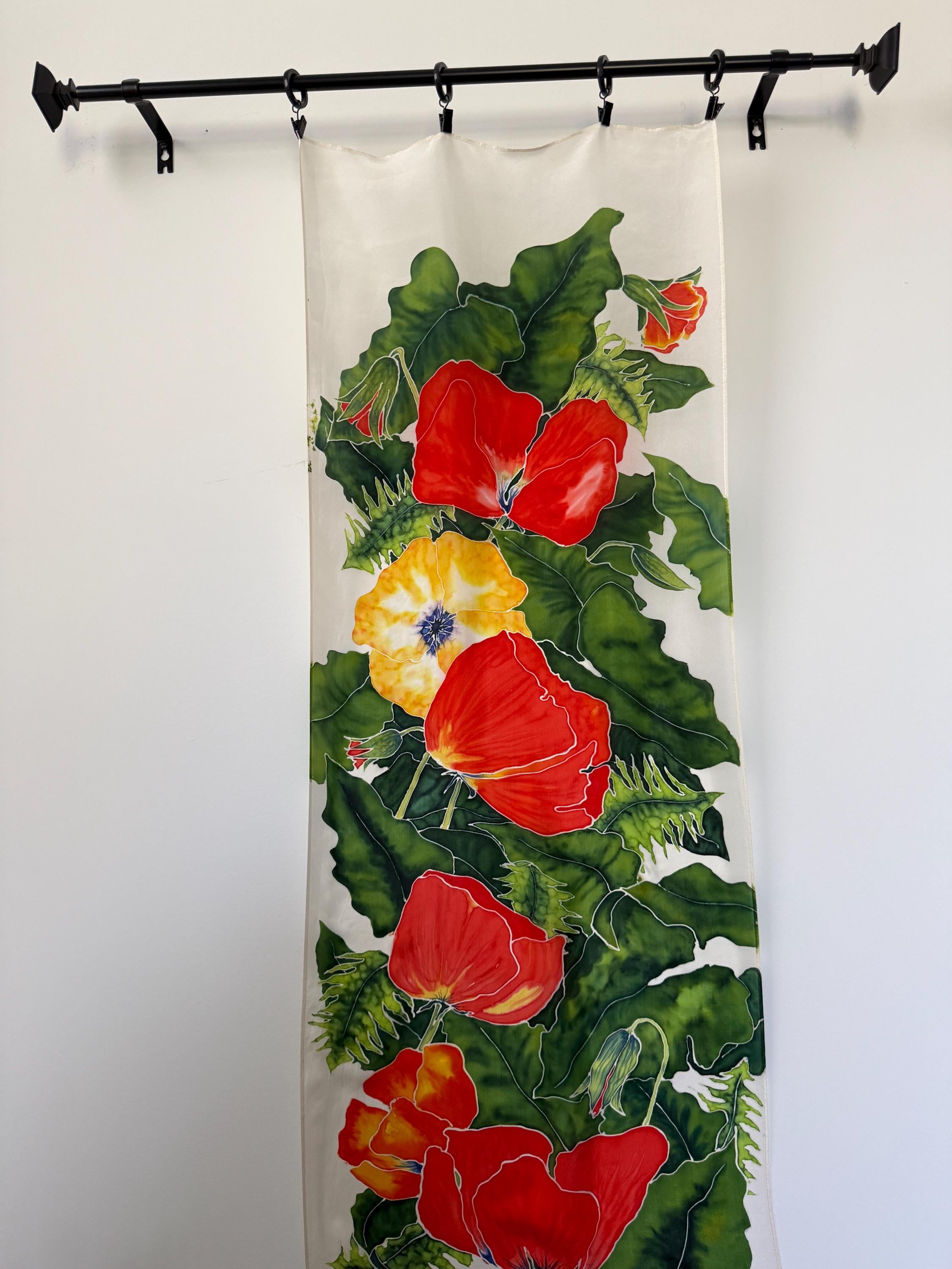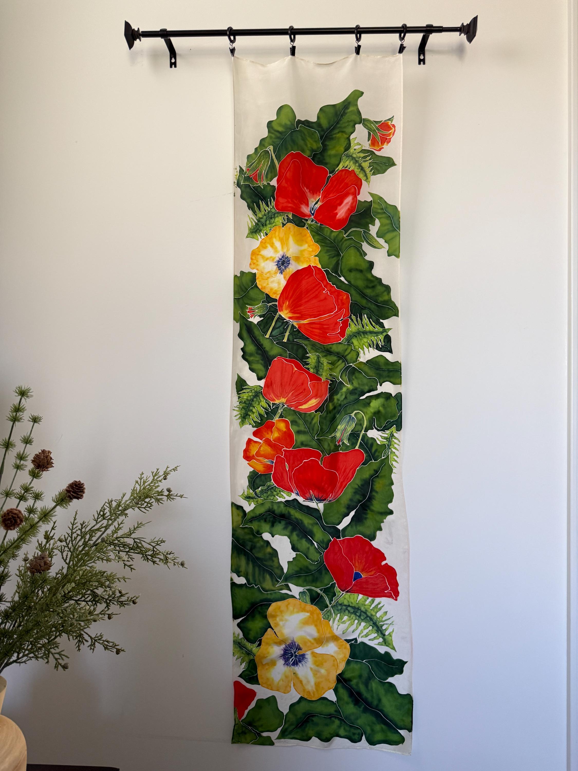 As in all of my hand painted silks, this is a one-of-a-kind tapestry, painted with French fabric dyes and has been steam set, hand washed and can be dry cleaned or hand washed. With these dimensions, there is ALWAYS a wall with room for art. If you would like to purchase this in different colors, please drop me an email as commissioned work is always available with a turn around time of 2-3 weeks.