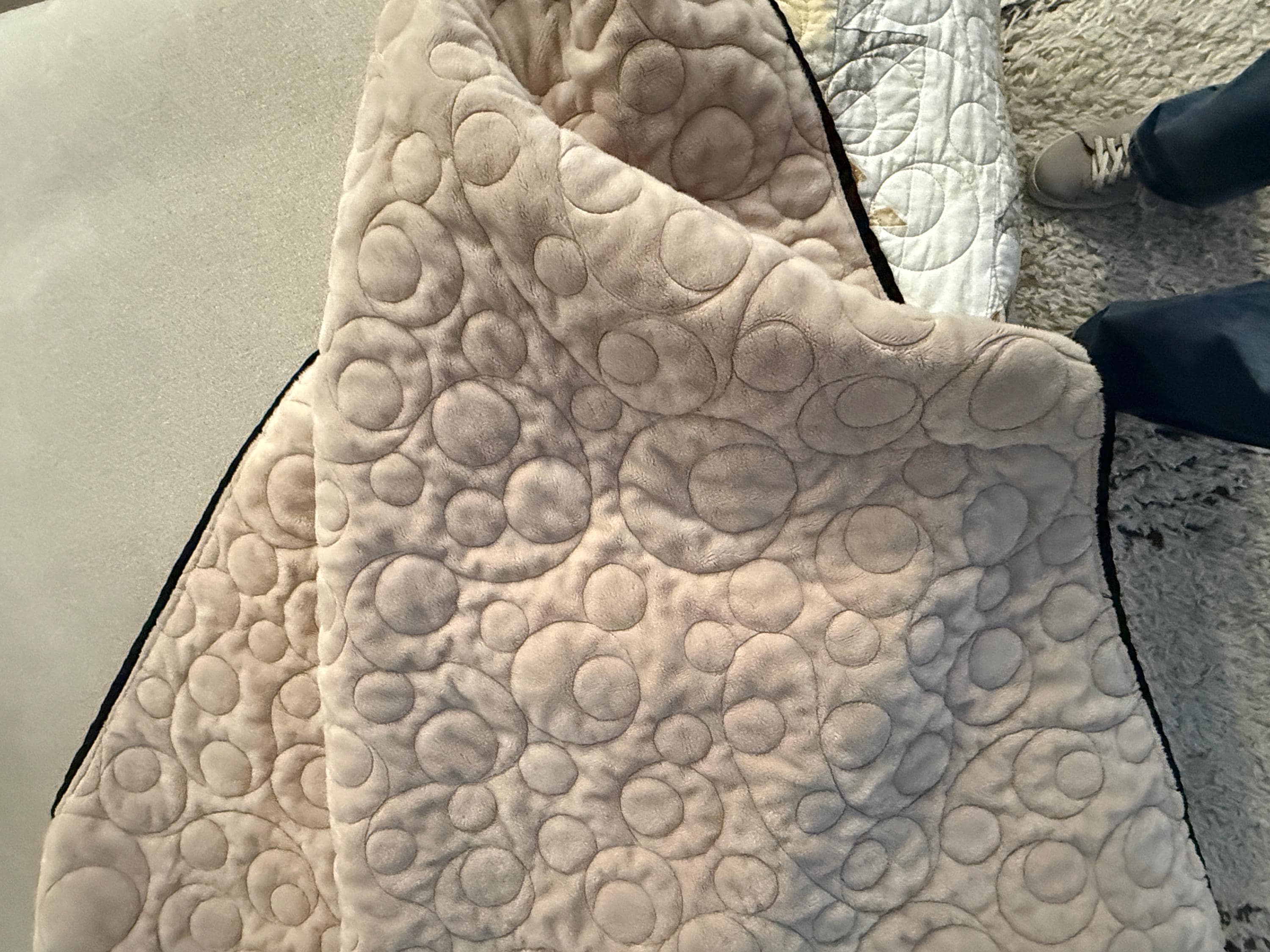This beautiful contemporary lap quilt is made of a orange and white 100% cotton fabric and backed with a plush soft white minky fabric, measuring 48” x 64”.