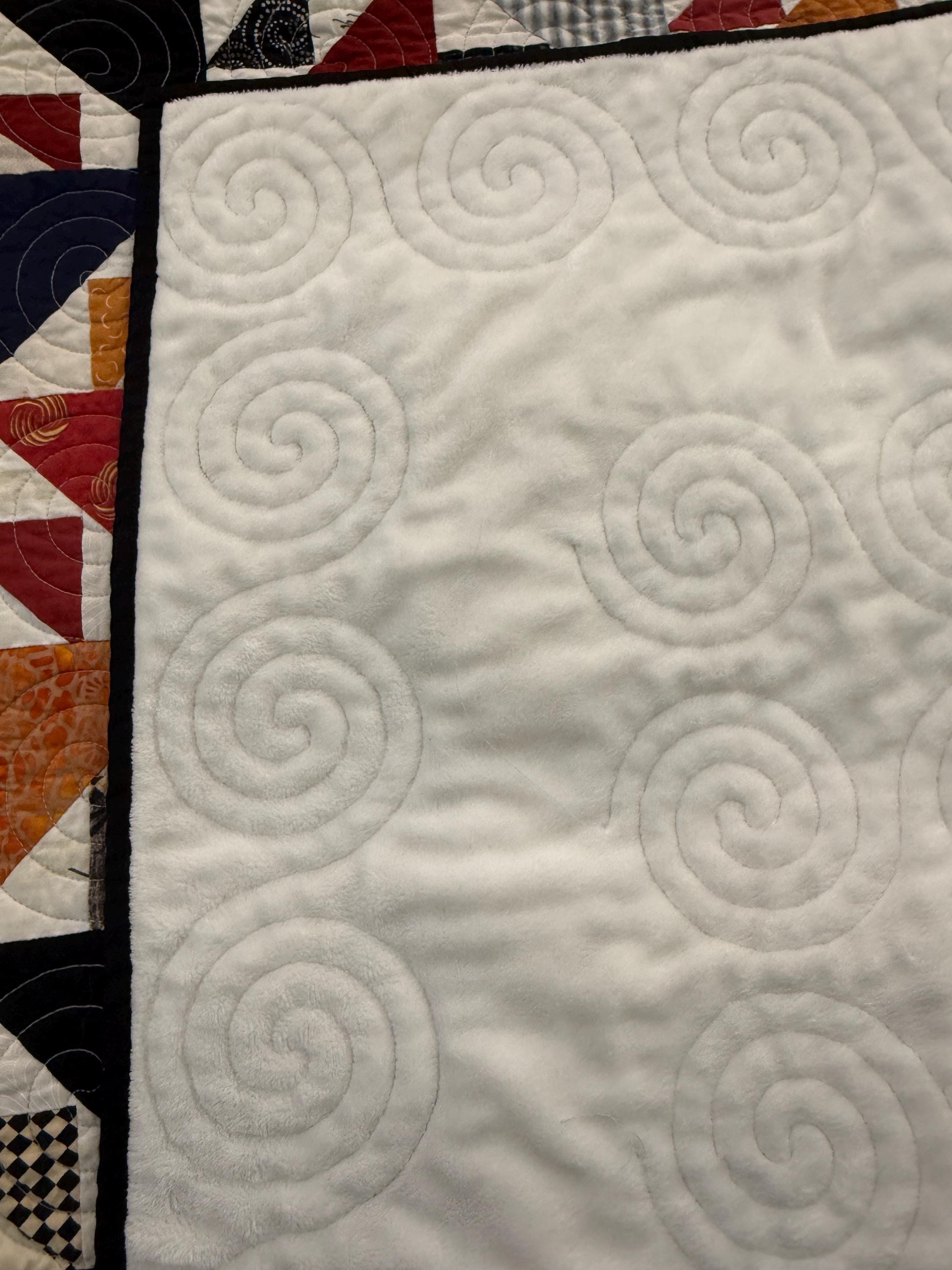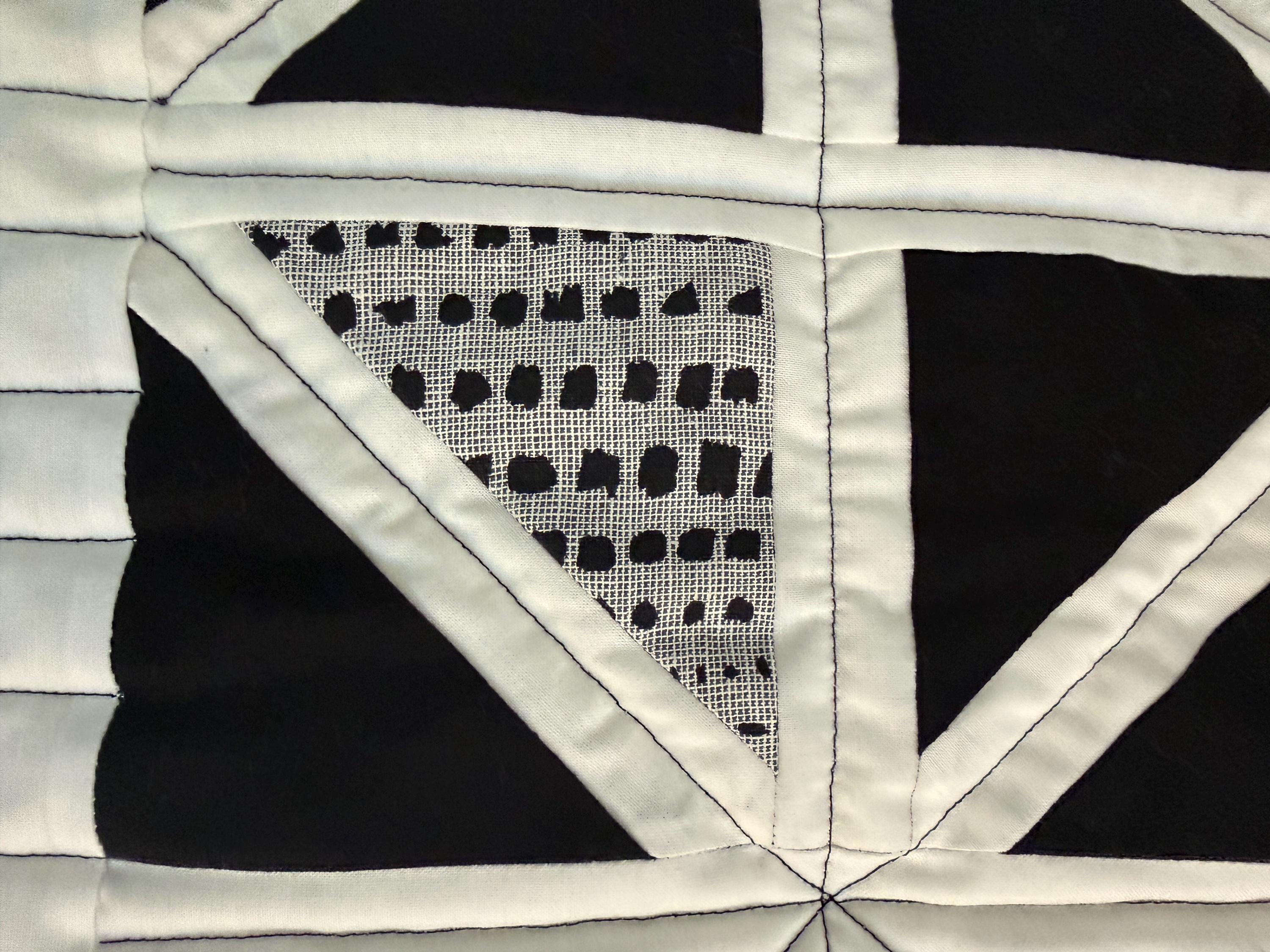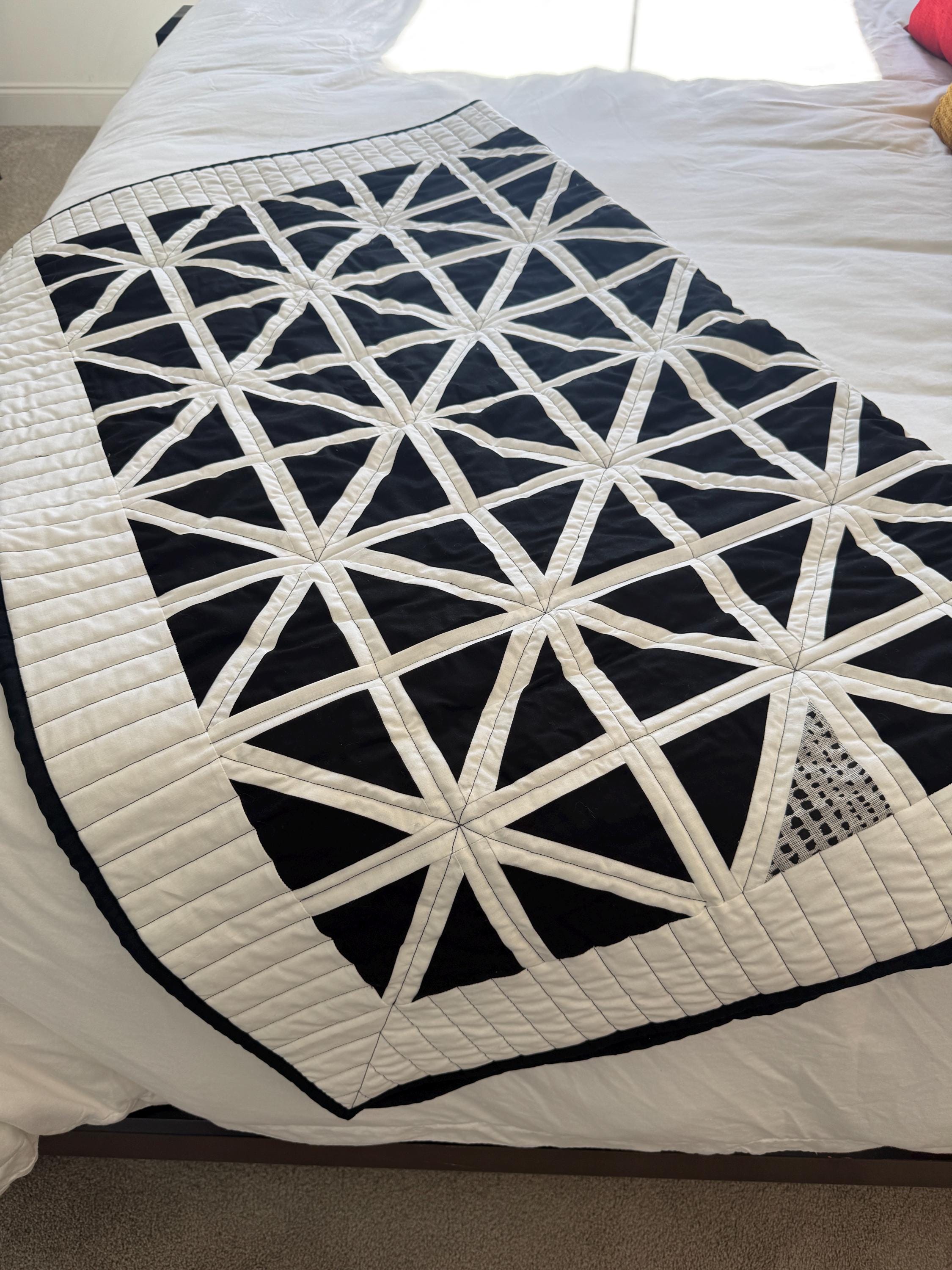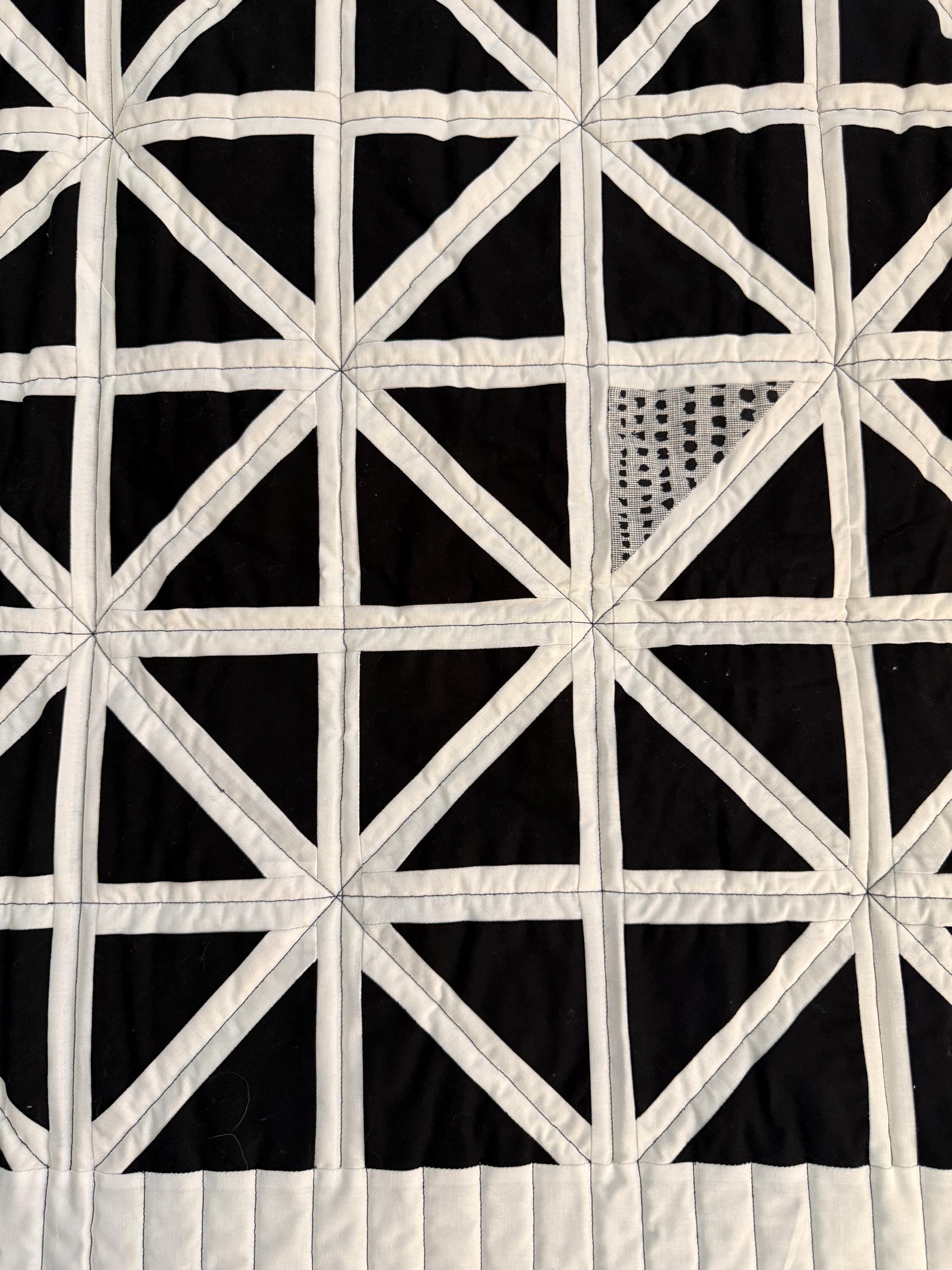 This striking black and white quilt blends timeless contrast with modern simplicity, making it a versatile piece for any space. Measuring approximately 48” x 60”, it’s the perfect size for a baby quilt, crib quilt, or a cozy lap throw.